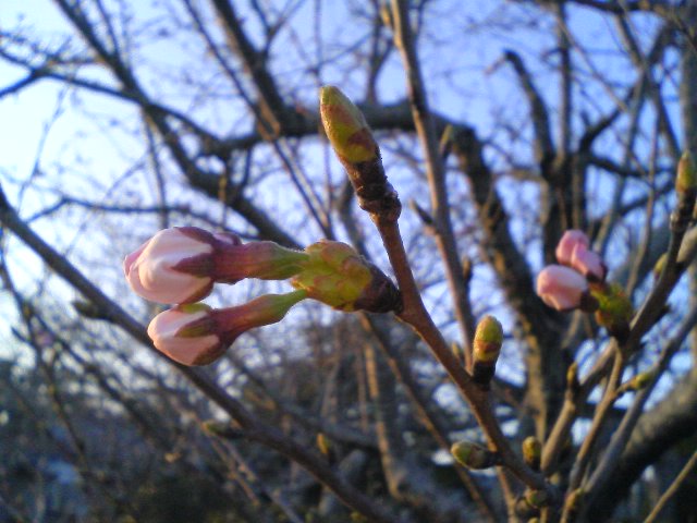 なんだか 春になったと想ったら イヤ、まだです!みたいな日が続くね。 でも職場の川沿いの桜は今日一斉に開花しだして 大きく大きく膨らんだ”つぼみ”は ちょっとの春めいた風に 敏感に反応していた。「春だょ~」「わかってるって^^」なんて おしゃべりも聴こえてきそう。 この”つぼみ”は うちの近くの神社の桜の木のもの。。まだ 少し出し惜しみ的な控えめな”つぼみ”ちゃんでした♪ なんか ふと 小学校の時のことを思い出した。 その映像は 木の机に座る小さな自分の手に 小学三年 国語やら 算数やら 初めての理科? 図工やらの教科書が 前の席のヨシカズから回ってくる。 漢字練習帳ももらえて… なんだか新しい教科書に丁寧に名前書いてるのに 浮かれた気持ちをなだめようと 想えば想うほど 凄まじいミスをする。「…ひろしっとォ…ォ ̄▽ ̄;¨¨」 お父ちゃんの名前じゃん。。。となりの 鋭いみっちゃんに 今日もバレてる。 教室の中を 窓からの光と 廊下から流れる冷気が 勝手に喧嘩してる。。 そんな アザヤカな色のついた まだ蒼い風景を想い出しました。。 春はいいね^~^。。