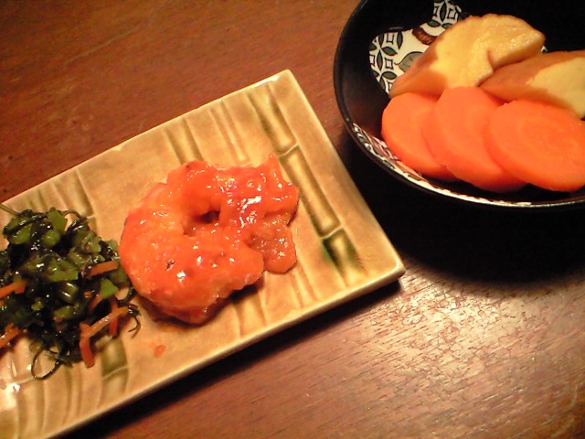小松菜とにんじんをめかぶで和えて お正月に余した 伊達巻を人参を加えて